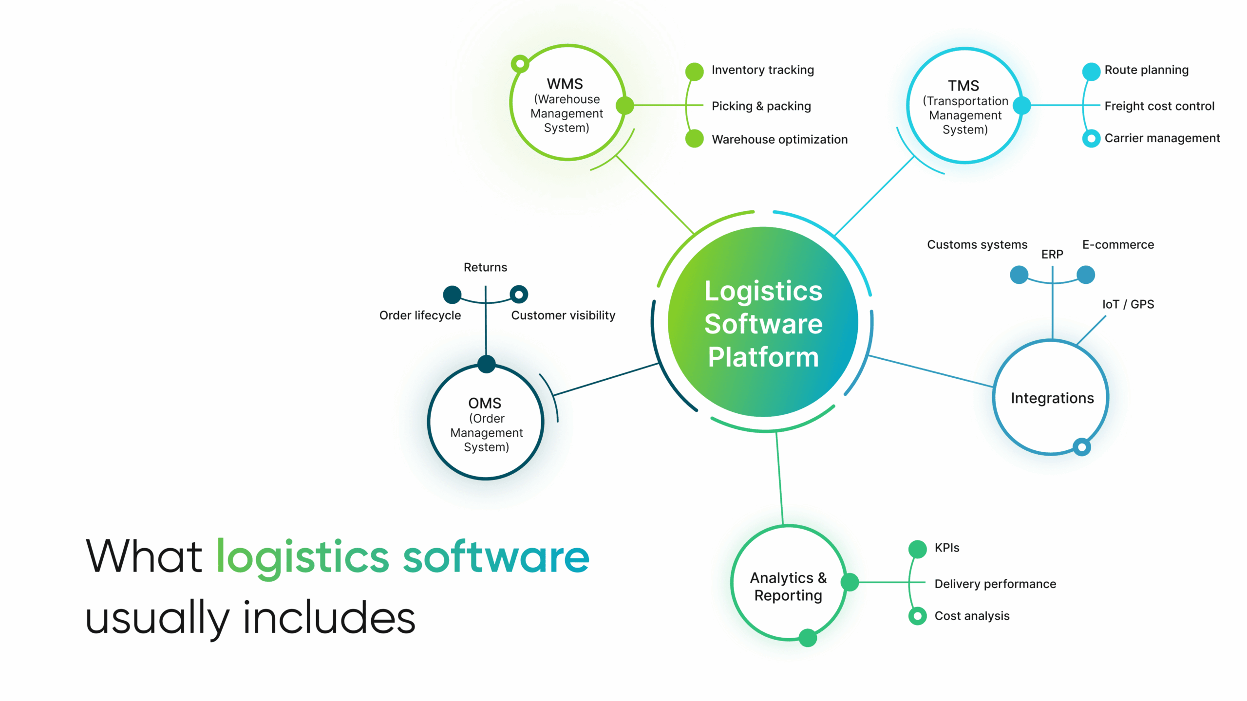 Logistics software includes modules like TMS (Transportation Management Systems), WMS (Warehouse Management Systems), and OMS (Order Management Systems). 𝗧𝗠𝗦 helps plan, control, and optimize transportation. Companies use TMS to create routes, select carriers, track cargo and reduce transportation costs. 𝗪𝗠𝗦 optimizes receiving, storage, shipping, and inventory. WMS helps reduce costs and speed up order processing.