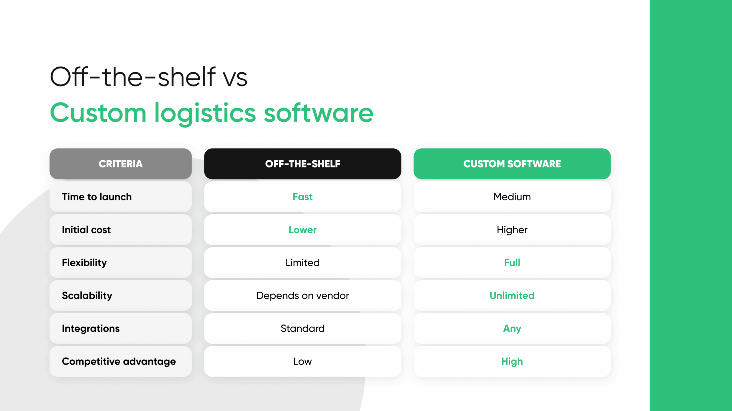 Off-the-shelf software covers many needs. But custom development can be the best choice if your logistics processes are unique. For example, a company with proprietary routing algorithms may find standard tools insufficient.